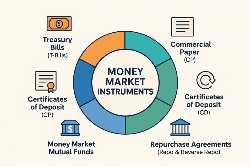 - Instruments: T-bills, CP, CDs, repos, MMFs